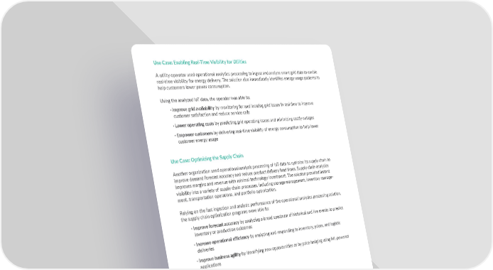Use Case: Enabling Real-Time Visibility for Utilities A utility operator used operational analytics processing to ingest and analyze smart grid data to enable real-time visibility for energy delivery. The solution also immediately identifies energy usage patterns to help customers lower power consumption. Using the analyzed IoT data, the operator was able to: · Improve grid availability by monitoring for and locating grid issues in real time to improve customer satisfaction and reduce service calls · Lower operating costs by predicting grid operating issues and minimizing costly outages · Empower customers by delivering real-time visibility of energy consumption to help lower customer energy usage Use Case: Optimizing the Supply Chain Another organization used operational analysis processing of IoT data to optimize its supply chain to improve demand forecast accuracy and reduce product delivery lead times. Supply chain analytics improves margins and revenue with minimal technology investment. The solution provided instant visibility into a variety of supply chain processes, including storage management, inventory manage- ment, transportation operations, and portfolio optimization. Relying on the fast ingestion and analytic performance of the operational analytics processing solution, the supply chain optimization programs were able to: · Improve forecast accuracy by analyzing a broad spectrum of historical and live events to predict inventory or production outcomes · Increase operational efficiency by analyzing and responding to inventory, prices, and logistic deliveries · Improve business agility by identifying new opportunities or by price hedging using ML-powered applications Additional Use Cases There are other ways to make use of analyzed IoT data, including: · End-to-end visibility: IoT in manufacturing can enable the monitoring of production lines starting from the refining process down to the packaging of final products. This complete monitoring of the process in real time provides insights that can be used to make adjustments in operations for better management of operational cost. · Improved safety: Analysis of IoT data might be used to improve worker safety and security in the plant. By monitoring the key performance indicators of health and safety (like the number of injuries and illness rates, near-misses, and short- and long-term absences), incidents and property damage or loss during daily operations might be avoided. · Enhanced collaboration with partners: By analyzing IoT-enabled machinery data, a manufacturer can share that operational information with partners like original equipment manufacturers, and with field engineers. Copyright (©) 2019 RTInsights Industrial IoT Data Collection & Analysis for Real-Time Decision-Making and Predictive Maintenance 10 Copyright (©) 2019 RTInsights Industrial IoT Data Collection & Analysis for Real-Time Decision-Making and Predictive Maintenance