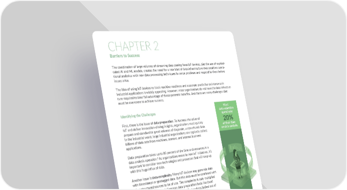 CHAPTER 2 Barriers to Success The combination of large volumes of streaming data coming from IoT devices, plus the use of sophisti- cated AI and ML models, creates the need for a new kind of data infrastructure that combines opera- tional analytics with new data processing techniques to sense problems and respond to them before issues arise. The idea of using IoT devices to track machine readiness and automate predictive maintenance in industrial applications is widely appealing. However, most organizations do not have the data infrastruc- ture required to take full advantage of these potential benefits. And there are many challenges that must be overcome to achieve success. Identifying the Challenges Most data scientists spend only First, there is the issue of data preparation. To harness the value of 20% IoT and deliver innovation-driving insights, organizations must quickly of their time prepare and standardize great volumes of disparate, unstructured data. on data analysis. In the industrial world, large industrial organizations can typically collect billions of data sets from machines, sensors, and internal business applications. Data preparation takes up to 80 percent of the time and resources in a data analysis operation.2 As organizations move to new IoT initiatives, it’s important to consider new technologies and processes that will keep up with this huge influx of data. Another issue is data complexity. Many IoT devices may generate data with timestamps or geotagged data. But this data must be combined with other structured sources to be of use. The complexity is only multiplied as more data is generated. Common data preparation tools like Excel can’t handle this complexity, which leaves skilled analysts locked out of working with the data. Data integration is yet another obstacle to success. Most analysis infrastructures are not designed to exchange or process the vast amounts of complex information pulled from sensors and connected 80% devices. It’s difficult to quickly integrate and enrich machine-generated data with data from business applications and data repositories. Greatly of their time adding to this problem is the fact that much of the data is siloed. is spent finding, cleaning, and reorganizing data. 2 https://www.infoworld.com/article/3228245/the-80-20-data-science-dilemma.html Copyright (©) 2019 RTInsights Industrial IoT Data Collection & Analysis for Real-Time Decision-Making and Predictive Maintenance 5 Copyright (©) 2019 RTInsights Industrial IoT Data Collection & Analysis for Real-Time Decision-Making and Predictive Maintenance