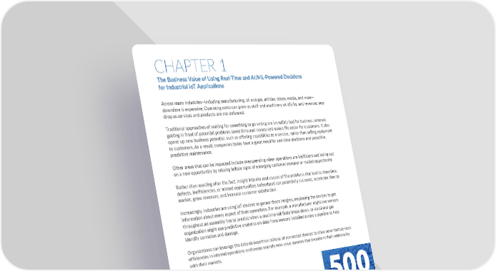 CHAPTER 1 The Business Value of Using Real-Time and AI/ML-Powered Decisions for Industrial IoT Applications Across many industries—including manufacturing, oil and gas, utilities, telcos, media, and more— downtime is expensive. Operating costs can grow as staff and machinery sit idly by, and revenues may drop as services and products are not delivered. Traditional approaches of waiting for something to go wrong are incredibly bad for business, whereas getting in front of potential problems saves time and money and makes life easier for customers. It also opens up new business potential, such as offering capabilities as a service, rather than selling equipment to customers. As a result, companies today have a great need for real-time decisions and proactive, predictive maintenance. Other areas that can be impacted include overspending when operations are inefficient and losing out on a new opportunity by missing telltale signs of emerging customer demand or market opportunity. Rather than reacting after the fact, insight into the root causes of the problems that lead to downtime, defects, inefficiencies, or missed opportunities beforehand can potentially cut costs, accelerate time to market, grow revenues, and increase customer satisfaction. Increasingly, industries are using IoT devices to garner those insights, employing the devices to get information about every aspect of their operations. For example, a manufacturer might use sensors throughout an assembly line to predict when a machine will likely break down, or an oil and gas organization might use predictive analytics on data from sensors installed across a pipeline to help identify corrosion and damage. Organizations can leverage the data derived from billions of connected devices to drive never-before-seen efficiencies in internal operations and create entirely new value streams that transform their relationship with their markets. Data Explosion Industrial IoT brings together connected intelligent devices and analytics 500 in a way that allows organizations to monitor, collect, exchange, analyze, and deliver valuable new insights about their systems and processes. zettabytes These insights can help drive smarter, faster business decisions. But one problem most companies encounter is that IoT devices produce very large volumes of data. One industry report estimated that by the THE AMOUNT OF DATA end of 2019, IoT devices will generate more than 500 zettabytes per year GENERATED PER YEAR in data (a zettabyte is a billion terabytes). That number is expected to grow exponentially in the years that follow.1 BY IoT DEVICES1 1 https://www.cisco.com/c/en/us/solutions/collateral/service-provider/global-cloud-index-gci/white-paper-c11-738085.html Copyright (©) 2019 RTInsights Industrial IoT Data Collection & Analysis for Real-Time Decision-Making and Predictive Maintenance 3