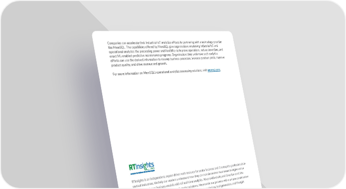 Companies can accelerate their industrial IoT analytics efforts by partnering with a technology provider like MemSQL. The capabilities offered by MemSQL give organizations employing industrial IoT and operational analytics the processing power and flexibility to improve operations, reduce downtime, and enact ML-enabled predictive maintenance programs. Organizations that undertake such analytics efforts can use the derived information to revamp business processes, increase product yields, improve product quality, and drive revenue and growth. For more information on MemSQL’s operational analytics processing solutions, visit memsql.com. RTInsights is an independent, expert-driven web resource for senior business and IT enterprise professionals in vertical industries. We help our readers understand how they can transform their businesses to higher-value outcomes and new business models with IoT real-time analytics. We provide clarity and direction amid the often confusing array of approaches and vendor solutions. We provide our partners with a unique combination of services and deep domain expertise to improve their product marketing, lead generation, and thought leadership activity. MemSQL is The No-Limits Database™ powering modern applications and analytical systems with a cloud-na- tive, scalable architecture for maximum ingest and query performance at the highest concurrency. MemSQL envisions a world where every business can make decisions in real time and every experience is optimized through data. Global enterprises use the MemSQL distributed database to easily ingest, process, analyze, and act on data in order to thrive in today’s insight-driven economy. MemSQL is optimized to run on any public cloud or on-premises with commodity hardware. Visit memsql.com or follow us @memsql. Copyright (©) 2019 RTInsights Industrial IoT Data Collection & Analysis for Real-Time Decision-Making and Predictive Maintenance 13