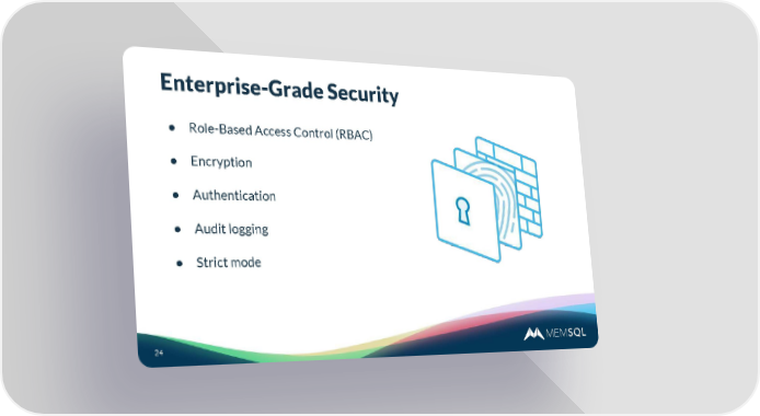 Interactive Introduction To MemSQL Page 23 Page 25Enterprise-Grade Security ● Role-Based Access Control (RBAC) ● Encryption ● Authentication ● Audit logging ● Strict mode 24