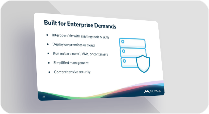 Interactive Introduction To MemSQL Page 22 Page 24Built for Enterprise Demands ● Interoperable with existing tools & skills ● Deploy on-premises or cloud ● Run on bare metal, VMs, or containers ● Simplified management ● Comprehensive security 23