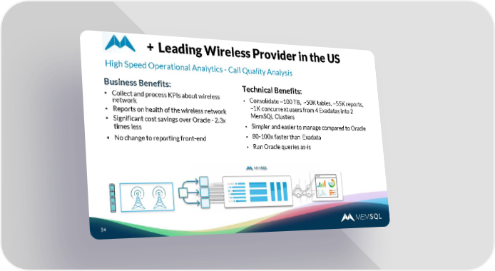 + Leading Wireless Provider in the US High Speed Operational Analytics - Call Quality Analysis Business Benefits: Technical Benefits: ▪ Collect and process KPIs about wireless ▪ Consolidate ~100 TB, ~50K tables, ~55K reports, network ~1K concurrent users from 4 Exadatas into 2 ▪ Reports on health of the wireless network MemSQL Clusters ▪ Significant cost savings over Oracle - 2.3x ▪ Simpler and easier to manage compared to Oracle times less ▪ 80-100x faster than Exadata ▪ No change to reporting front-end ▪ Run Oracle queries as-is 34