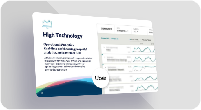 High Technology Operational Analytics Real-time dashboards, geospatial analytics, and customer 360 At Uber, MemSQL provides a live operational view into activity for millions of drivers and customers every day, delivering geospatial views for optimizing service delivery and managing day-to-day operations 3377