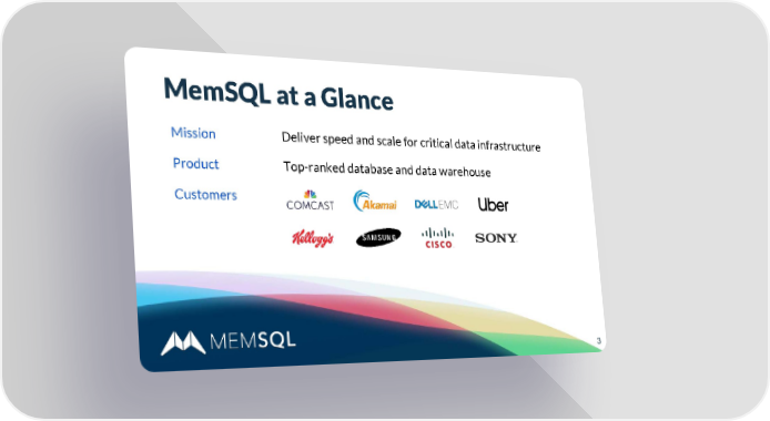 MemSQL at a Glance Mission Deliver speed and scale for critical data infrastructure Product Top-ranked database and data warehouse Customers 3