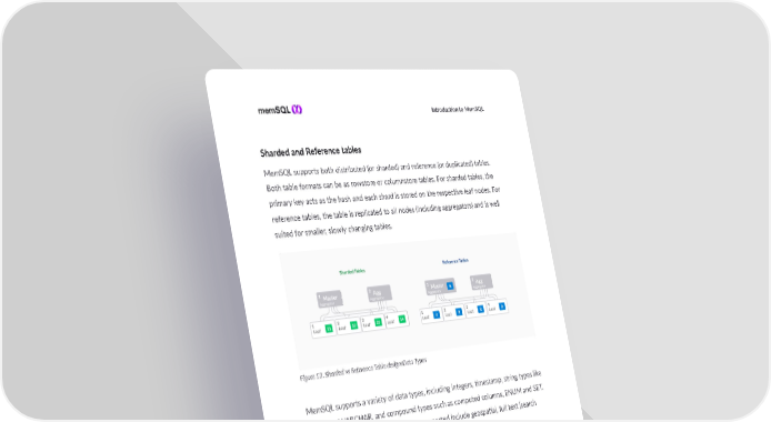I ntroducon to MemSQL Sharded and Reference tables MemSQL supports both distributed (or sharded) and reference (or duplicated) tables. Both table formats can be as rowstore or columnstore tables. For sharded tables, the primary key acts as the hash and each shard is stored on the respecve leaf nodes. For reference tables, the table is replicated to all nodes (including aggregators) and is well suited for smaller, slowly changing tables. Figure 13. Sharded vs Reference Table designsData Types MemSQL supports a variety of data types, including integers, mestamp, string types like CHAR and VARCHAR, and compound types such as computed columns, ENUM and SET. Addional complex data types that are supported include geospaal, full text (search capability), and semi-structured JSON data. Parallel Data Ingest with Pipelines MemSQL Pipelines is a MemSQL database feature that ingests data from external sources in a connuous manner. As a built-in component of the database, Pipelines can extract, transform, and load external data without the need for third-party tools or middleware. 19