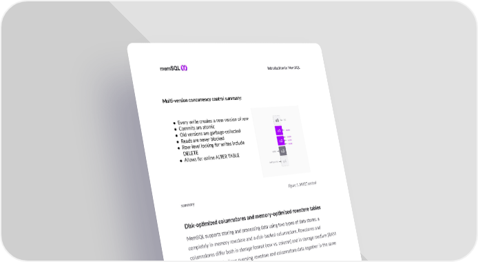 I ntroducon to MemSQL Mul-version concurrency control summary: ● Every write creates a new version of row ● Commits are atomic ● Old versions are garbage-collected ● Reads are never blocked ● Row-level locking for writes include DELETE ● Allows for online ALTER TABLE Figure 5. MVCC control summary Disk-opmized columnstores and memory-opmized rowstore tables MemSQL supports storing and processing data using two types of data stores: a completely in-memory rowstore and a disk-backed columnstore. Rowstores and columnstores differ both in storage format (row vs. column) and in storage medium (RAM vs. disk). MemSQL allows querying rowstore and columnstore data together in the same query. The rowstore is typically used for highly concurrent online transacon processing (OLTP) and mixed OLTP/analycal workloads. The whole data set is kept in memory - providing fast writes and supporng thousands of concurrent queries. Rowstores uses a transacon log to avoid disk I/O bolenecks on writes. Transacons are commied to disk as logs and periodically compressed as snapshots of the enre database. 11