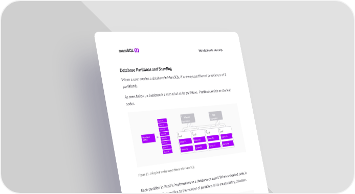 I ntroducon to MemSQL Database Parons and Sharding When a user creates a database in MemSQL, it is always paroned (a minimum of 2 parons). As seen below , a database is a sum of all of its parons. Parons reside on the leaf nodes. Figure 11. Using leaf nodes as parons with MemSQL Each paron in-itself is implemented as a database on a leaf. When a sharded table is created, it is split according to the number of parons of its encapsulang database. Each paron will hold a slice of the table. Figure 12. Leveraging shard keys for distributed tables 18