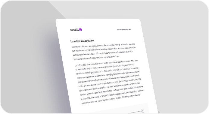 I ntroducon to MemSQL Lock-Free data structures Tradional databases use locks (latches and enqueues) to manage serializaon and they run into issues such as deadlocks or priority inversion, when processes block each other as they complete execuon. This results in performance and scalability issues with increasing volumes of concurrent read and write operaons. Lock-free data structures that enable beer scalability and performance are at the core of MemSQL’s engine. Every component of the engine is built using lock-free data structures including queues, stacks, hash tables, skip lists, and linked lists. For superior memory management and efficiently managing transacon state, lock-free queues and stacks are used throughout the system. In the area of code generaon, lock-free hash tables are used to map query shapes to the compiled plans in the plan cache. MemSQL also implements lock-free skip lists and hash tables that are kept in memory for fast, random access to data. Lock-free skip lists are the primary index-backing data structure in MemSQL. Compared to B-trees for disk-based databases, skip lists perform extremely well in-memory and under high concurrency, thereby delivering beer scalability. Figure 4. Skiplist index 9