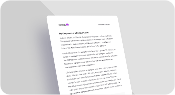 I ntroducon to MemSQL Key Components of a MemSQL Cluster As shown in Figure 5, a MemSQL cluster consists of aggregator nodes and leaf nodes. The aggregator serves as a query interceptor and router, manages cluster metadata and is responsible for cluster monitoring and failover. A leaf node is a MemSQL server instance that stores data and executes queries issued by the aggregator. In typical deployments, the aggregator-to-leaf node rao is generally 1:5. Increasing the number of aggregators can improve operaons like data loading and can allow for MemSQL to process more client requests concurrently. Applicaons serving many clients have a higher aggregator-to-leaf rao, and those with more demanding storage requirements need more leaves per aggregator. Client applicaons connect to an aggregator, which serves as the query router in the cluster. When the client sends a SQL query, the aggregator will parse, compile and distribute the query across the leaf nodes. In the leaf node, MemSQL may further opmize the query as needed and execute on the local store of data. This allows MemSQL to maintain high query performance even with rapidly changing data. The leaf nodes quickly compute the query results and send them back to the aggregator. The aggregator then aggregates the results from each leaf and sends the final result back to the client. Figure 10. Massively parallel processing for query execuon 17