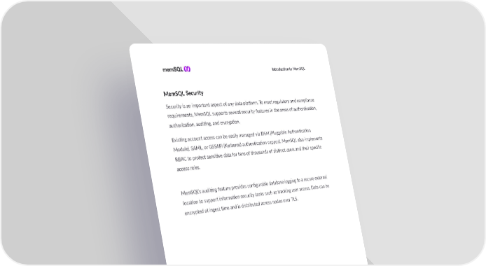 I ntroducon to MemSQL MemSQL Security Security is an important aspect of any data plaorm. To meet regulatory and compliance requirements, MemSQL supports several security features in the areas of authencaon, authorizaon, auding, and encrypon. Exisng account access can be easily managed via PAM (Pluggable Authencaon Module), SAML, or GSSAPI (Kerberos) authencaon support. MemSQL also implements RBAC to protect sensive data for tens of thousands of disnct users and their specific access roles. MemSQL’s auding feature provides configurable database logging to a secure external locaon to support informaon security tasks such as tracking user access. Data can be encrypted at ingest me and is distributed across nodes over TLS. 24
