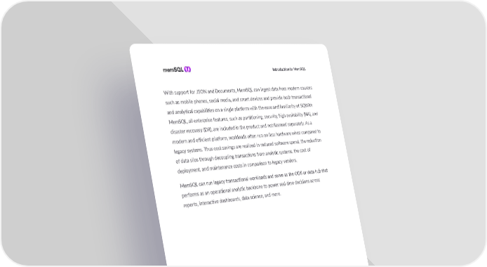 I ntroducon to MemSQL With support for JSON and Documents, MemSQL can ingest data from modern sources such as mobile phones, social media, and smart devices and provide both transaconal and analycal capabilies on a single plaorm with the ease and familiarity of SQWith MemSQL, all enterprise features, such as paroning, security, high availability (HA), and disaster recovery (DR), are included in the product and not licensed separately. As a modern and eļ¬cient plaorm, workloads oen run on less hardware when compared to legacy systems. Thus cost savings are realized in reduced soware spend, the reducon of data silos through decoupling transacons from analyc systems, the cost of deployment, and maintenance costs in comparison to legacy vendors. MemSQL can run legacy transaconal workloads and serve as the ODS or data hub that performs as an operaonal analyc backbone to power real-me decisions across reports, interacve dashboards, data science, and more. 6