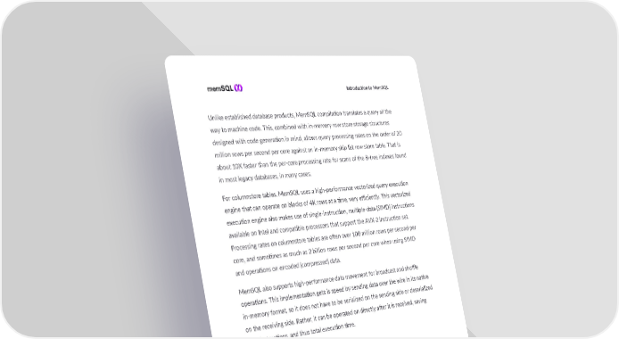 I ntroducon to MemSQL Unlike established database products, MemSQL compilaon translates a query all the way to machine code. This, combined with in-memory row store storage structures designed with code generaon in mind, allows query processing rates on the order of 20 million rows per second per core against an in-memory skip list row store table. That is about 10X faster than the per-core processing rate for scans of the B-tree indexes found in most legacy databases, in many cases. For columnstore tables, MemSQL uses a high-performance vectorized query execuon engine that can operate on blocks of 4K rows at a me, very efficiently. This vectorized execuon engine also makes use of single-instrucon, mulple-data (SIMD) instrucons available on Intel and compable processors that support the AVX-2 instrucon set. Processing rates on columnstore tables are oen over 100 million rows per second per core, and somemes as much as 2 billion rows per second per core when using SIMD and operaons on encoded (compressed) data. MemSQL also supports high-performance data movement for broadcast and shuffle operaons. This implementaon gets is speed by sending data over the wire in its nave in-memory format, so it does not have to be serialized on the sending side or deserialized on the receiving side. Rather, it can be operated on directly aer it is received, saving CPU instrucons, and thus total execuon me. Query Processing Summary Together, compiled query plans, flexible storage opons, lock-free data structures, MVCC and a mature opmizer allows for beer performance on mulple cores with high data accessibility, even under high concurrency. This is part of the "secret sauce" that makes MemSQL different than other data plaorms out there. 15